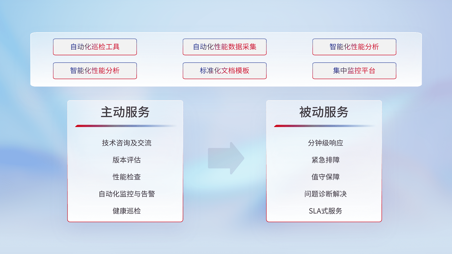 智能化工具和标准化文档,,保障服务质量,,,提供主动服务(包含技术咨询、、、、版本评估、、、性能检查、、自动化监控与告警、、、、健康巡检)和被动服务包含(分钟级响应、、、、紧急排障、、、、值守保障、、、、问题诊断解决、、、SLA服务)。。。